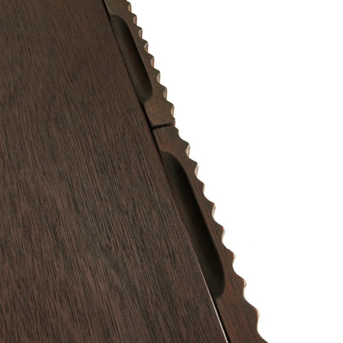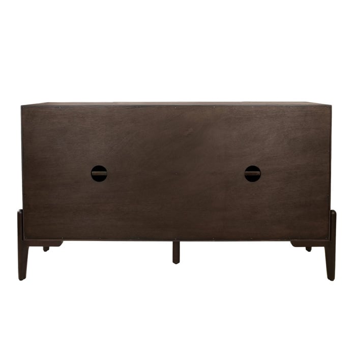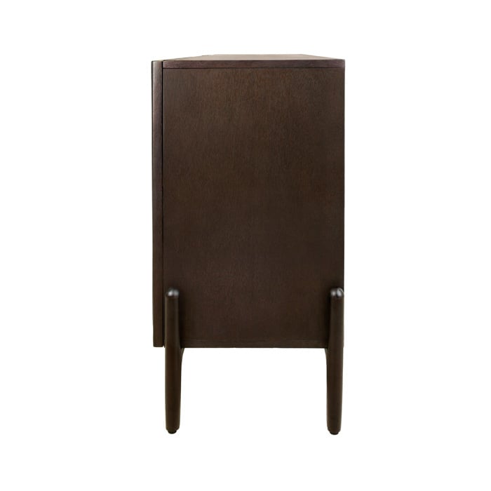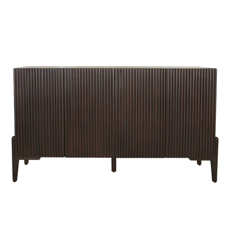 • Crafted with a sleek ribbed facade and a rich dark brown finish, this piece brings texture and sophistication to any dining or living space. 4 doors, solid wood legs, wire management.