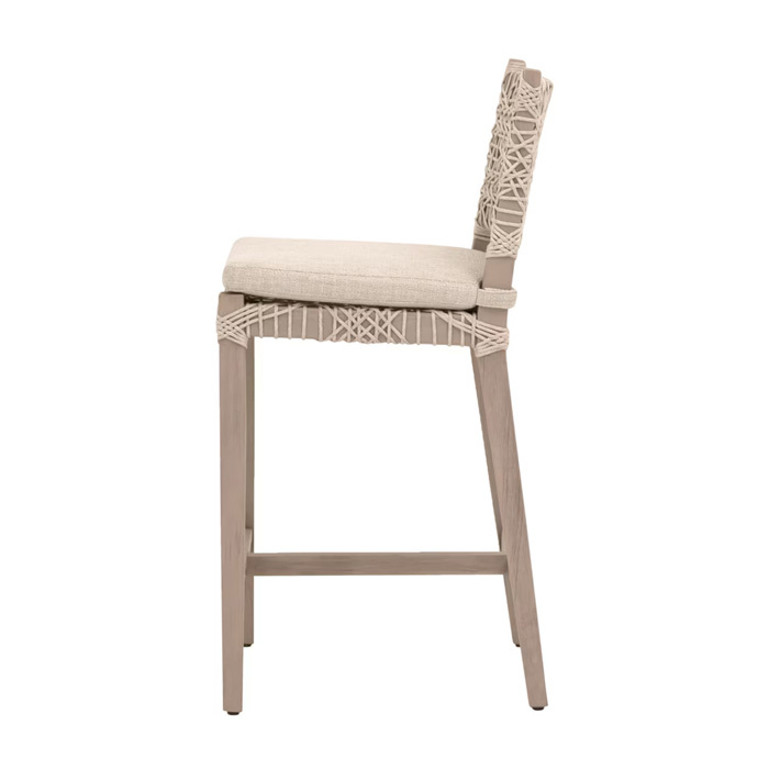 Outdoor suitable. Teak frame in Washed Ever finish, Polyolefin rope, and 100% Olefin performance fabric. Due to natural materials used, changes in tone and texture will occur over time.