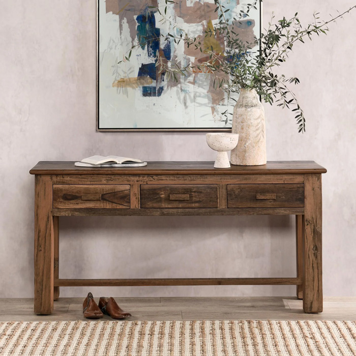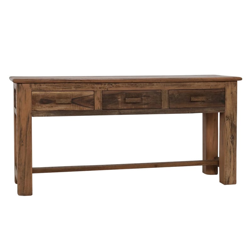 • Handcrafted from eco-friendly salvaged wood, the table showcases rich grain patterns and a warm natural finish. Three spacious storage drawers to keep essentials organized.