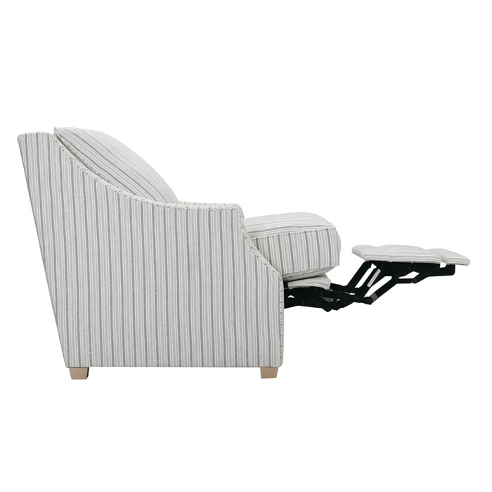 Recliner requires zero wall clearance and features a powered recliner mechanism.