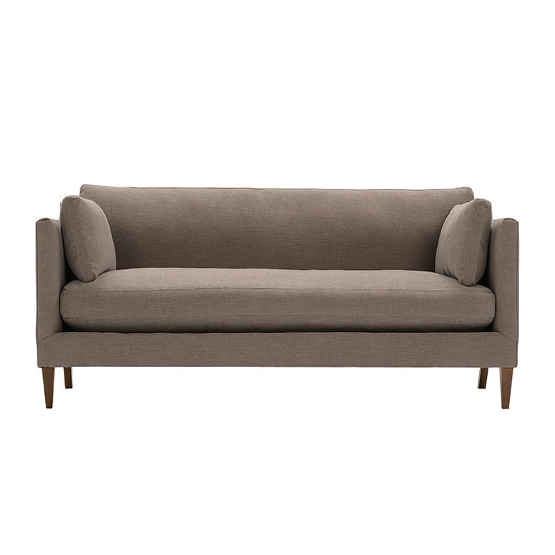 Light blue apt sofa image shows style without nailhead trim. Mushroom sofa image shows style with tapered leg.